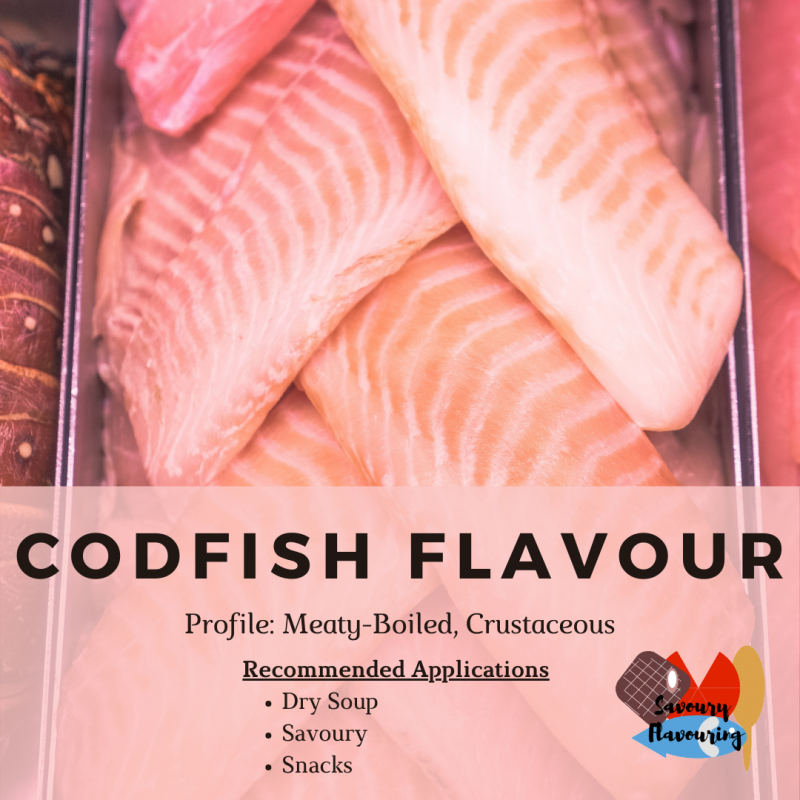 Cod Fish Flavour has a Meaty-boiled, Fish (Shell-fish), Crustaceous profile.