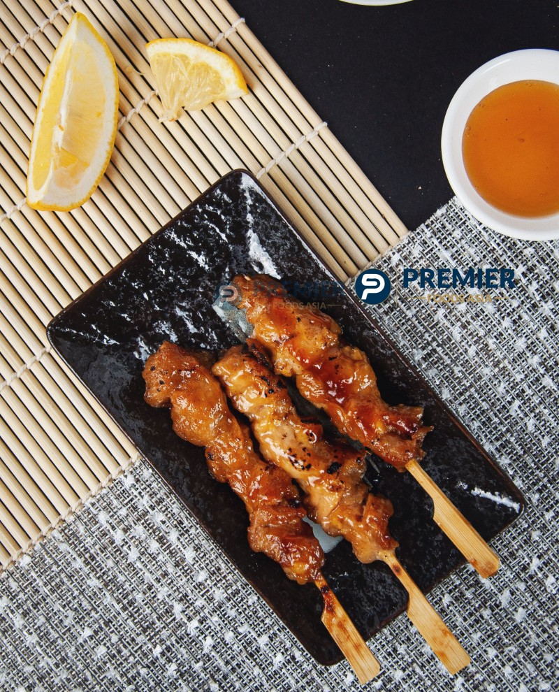 BonELESS CHICKEN LEGS, SKEWERED AND MARINATED IN SWEET-SAVOURY YAKITORI SAUCE.