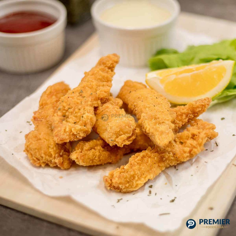 CHICKEN BREAST STRIPS MARINATED WITH GARLIC FLAVORED SEASonING AND COATED WITH CRISPY BREADCRUMBS!